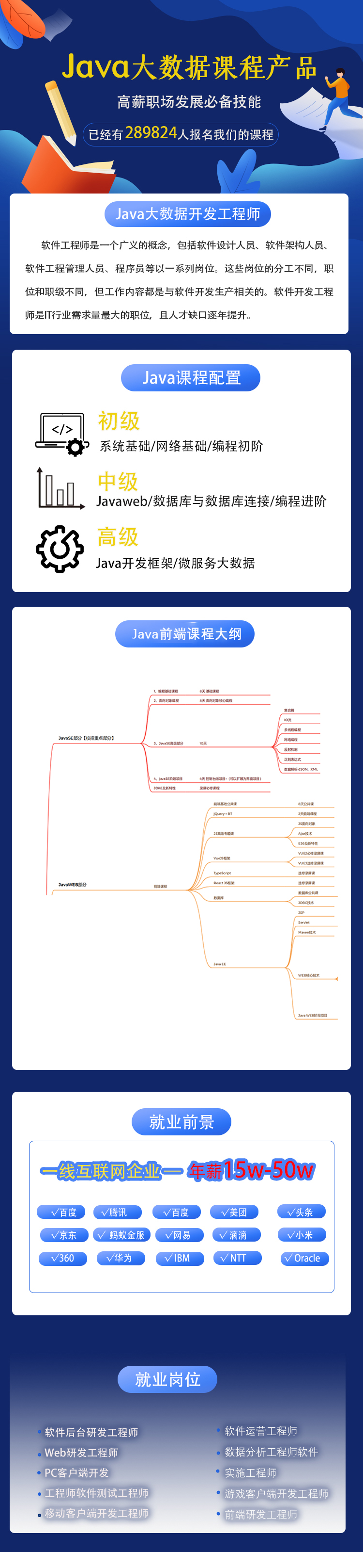 Java大数据开发简称大数据开发,它以使用Java语言为主,负责大规模数据的处理和应用,与大数据可视化分析工程师相互配合,从数据中挖掘出价值,为企业业务发展提供支持。